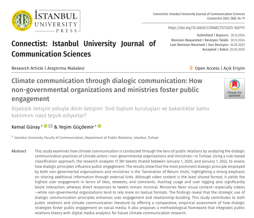 Kaynak Makale: Günay, K. & Güçdemir, Y. (2025). Climate communication through dialogic communication: How non-governmental organizations and ministries foster public engagement. Connectist: Istanbul University Journal of Communication Sciences, (68), 54-71.